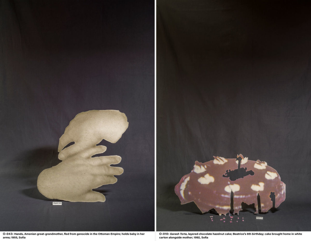 The sequencing of Forensic Excavations Inventory is ruled by disorder, not chronology, to reflect the lives that have been broken apart by intergenerational trauma. ‘The way the story is spun across unrelated objects, in a non-linear way, reflects how trauma memory is formed,’ explains Moumdjian. ‘The body, at the time of the traumatic chain of events, is unable to cognitively process the event, so the emotions of fear or sadness, terror or loneliness are stored in the brain and body at various spots, not linked to the actual event that one might remember.’