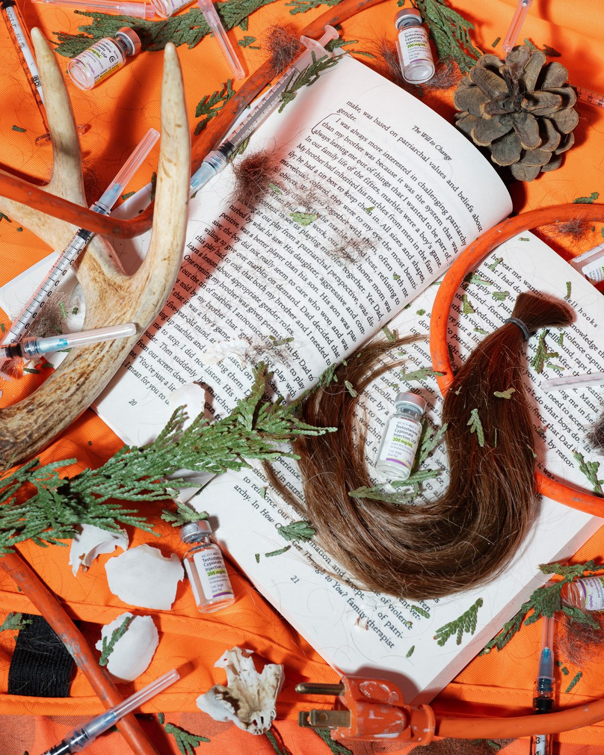 Pine reflects on their lived experience and their relationships with the men in their family. Personal artifacts such as hair, testosterone, scavenged objects and family photographs serve as entry points into a broader exploration of lineage. In Self-Portrait With My Father and Brother, Pine holds an image of a hunting trip they were excluded from, an annual rite shared between father and son. That exclusion becomes the starting point for this body of work, prompting questions about what is passed down, what is withheld, and how new forms of masculinity might take shape.