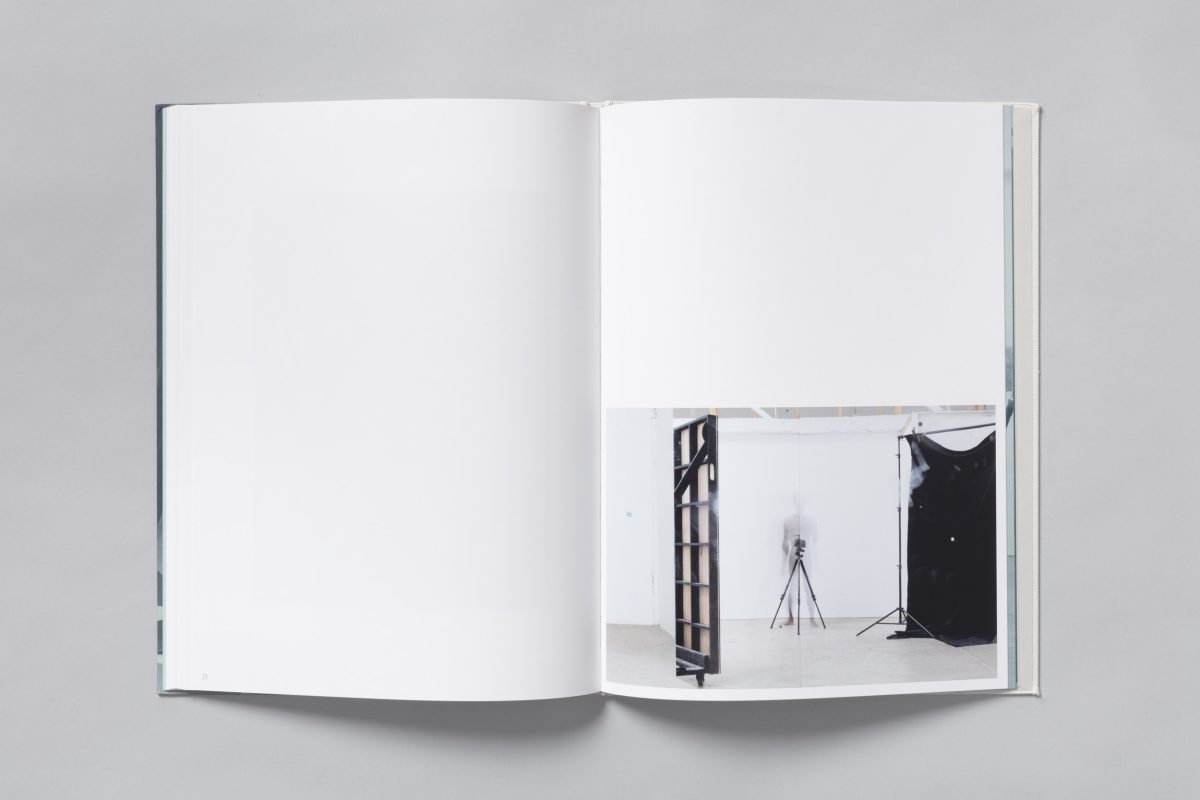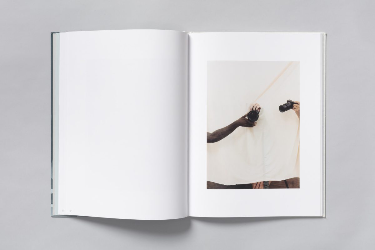 The black backdrop invades the image. The barely noticeable camera lens peeking out from a hole in the dark fabric is a foreshadowing, snapping its reflection in the mirror – which itself is marked, smudged, dirty. The dust smeared across its surface indicates us towards a filter of uncleanliness, or to one of obscurity. Flip the page and the glory hole is realized, a hard and white phallus standing to attention, the only other item a paper clip resting on a wooden table below. The book finishes with a few more portrait shots and ends on a quiet note – a return to the landscape of the studio reflected back at us. This time, Sepuya’s figure stands behind the camera and its tripod – a ghostly figure halved in blurred movement. Not quite locateable. An ode to the fickleness of the camera, the insidious and rather false ambiguity of the lens, the elusive nature of queer and racialized identity and sexuality in a hyper-capitalist and consumerist world.