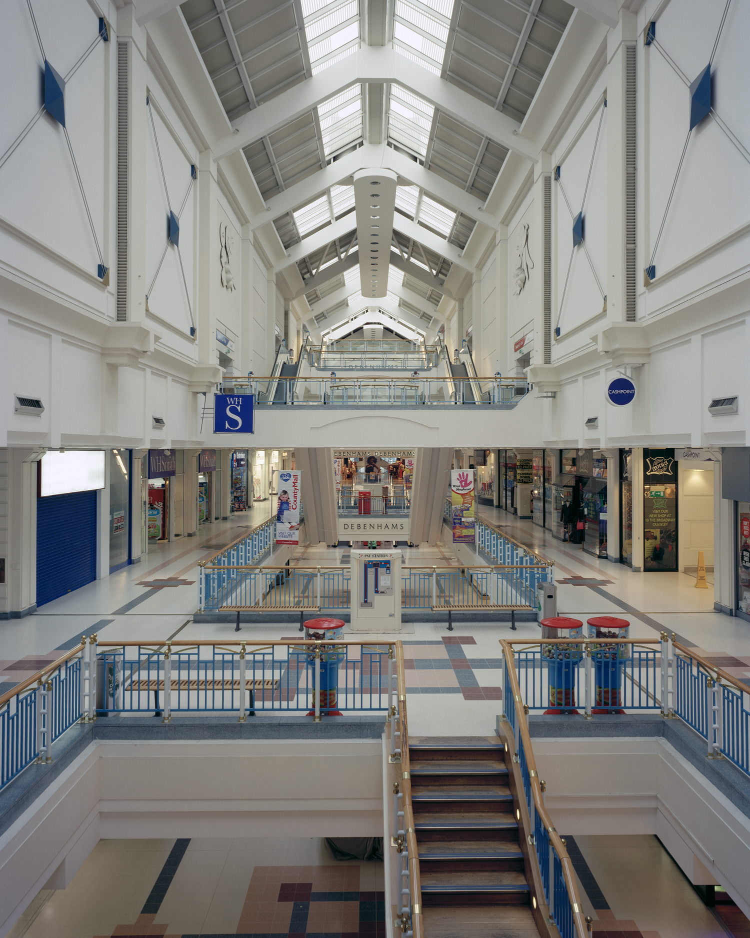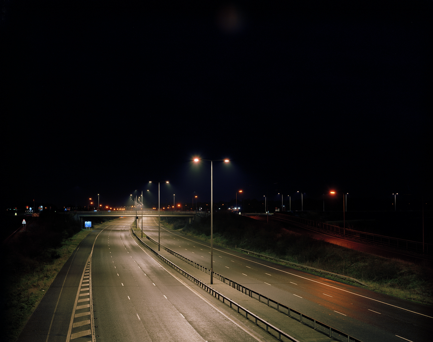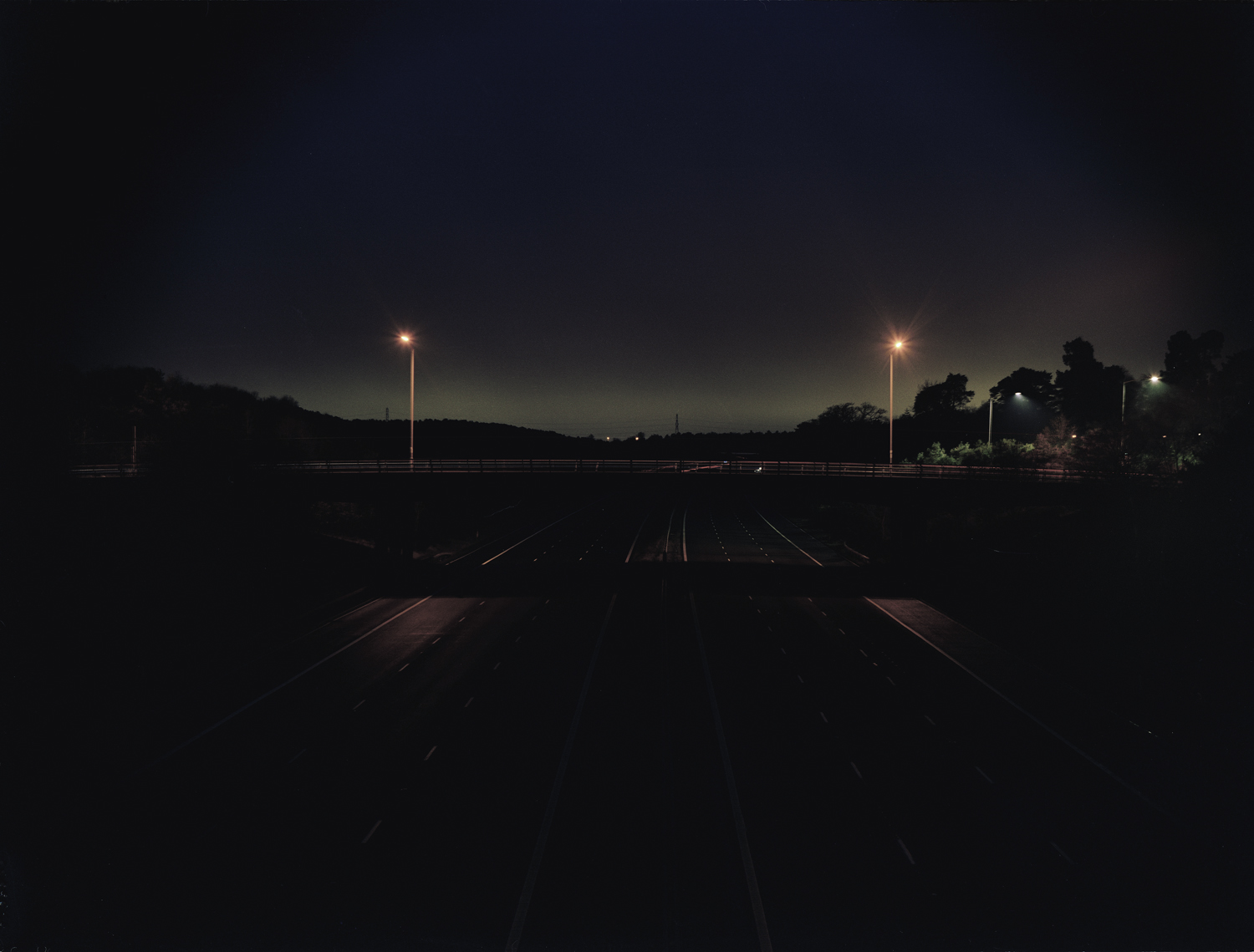 The absence of identifiable individual human figures is consistent across most of my work to date, but has different inflections from series to series. In those that involve suburban, common or woodland environments the spaces are often depopulated, so human absence is less remarkable in these kinds of works. In other specific series such as Motorways and Shopping Centre Interiors, human absence is actively produced by the photographic process both logistically and technically. The latter series is usually made with the camera very early in the morning before the spaces are open to the public. The former pictures are made up of multiple exposures when no activity is visible. In both these works the viewer is invited to imaginatively enter into an unusually solitary experience at odds with how the space might otherwise be encountered. All my work makes visible our act of seeing, if not our actual bodies in the world; this always involves a social dimension.