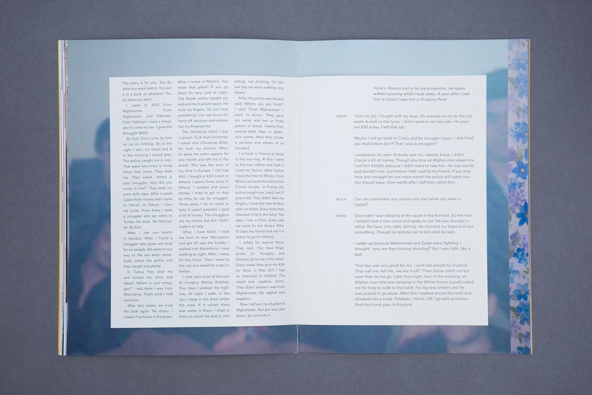 For Nothing is Impossible Under the Sun Alice took photographs on negotiated terms and incorporated rich materials such as drawings, writing, Facebook photographs and conversations. Her aim was to shape a complex representation of people who are legally invisible and the separate space to which they are consigned.