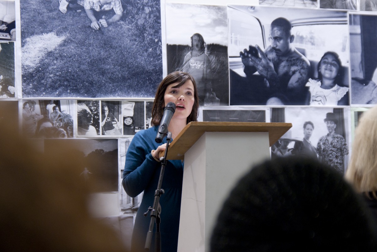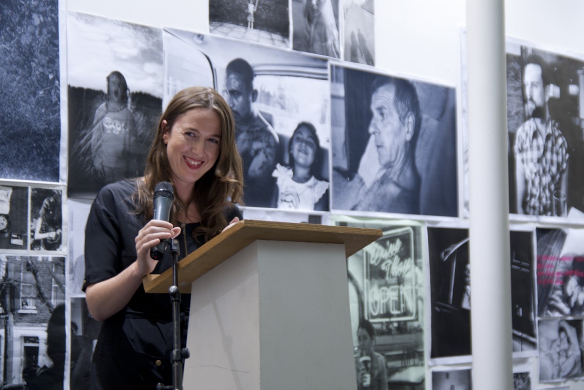 Celia Davies, Photoworks Director addresses guests at the opening of Jerwood Encounters: Family Politics, curated by Photoworks 2013. Photo: this is tomorrow