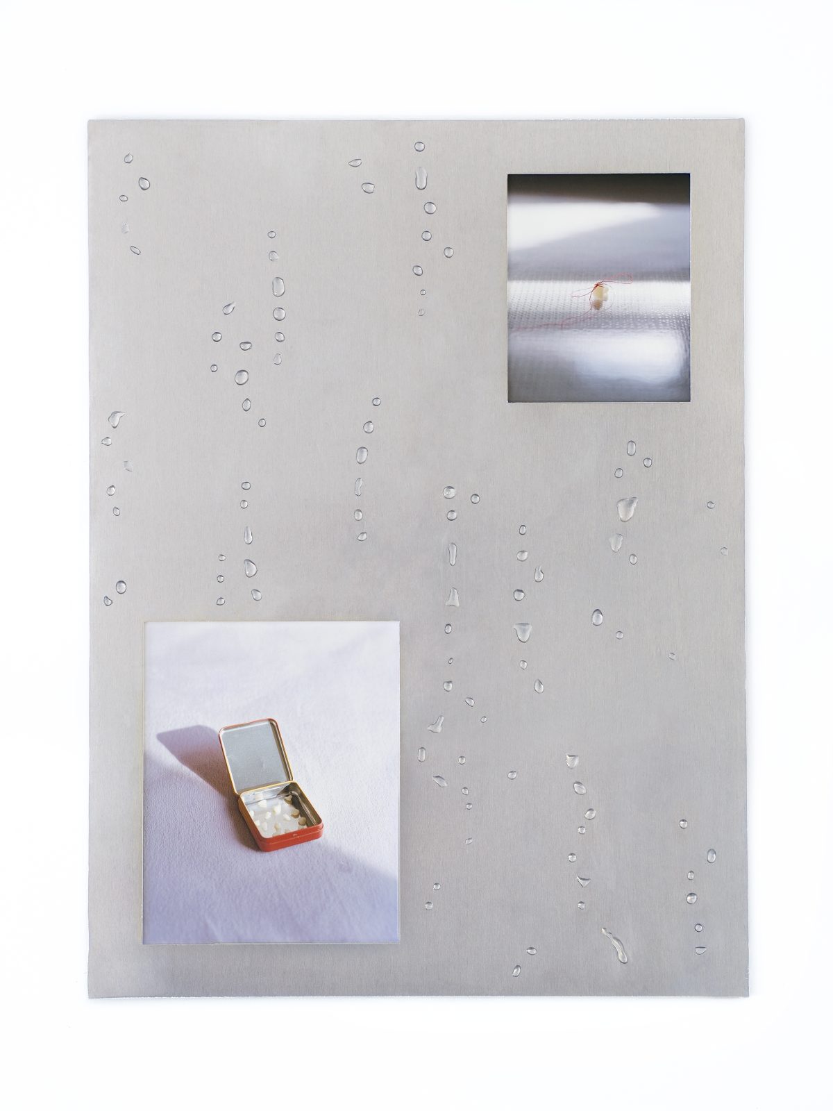 Rain appears in the image as traces. I use resin to create raindrop textures on aluminum, suggesting the slow passage of weather. These are placed with two printed images of domestic still life. The boundaries between inside and outside overlap, as if flowing towards an unknown place.