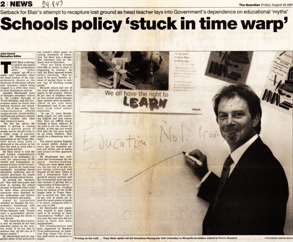 In a matter of seconds Blair had written the slogan and underlined it with a broad sweep of his pen. He kept the tip firmly in place at the end of the line, turned to face the cameras and punctuated his own photo-opportunity with a broad grin.