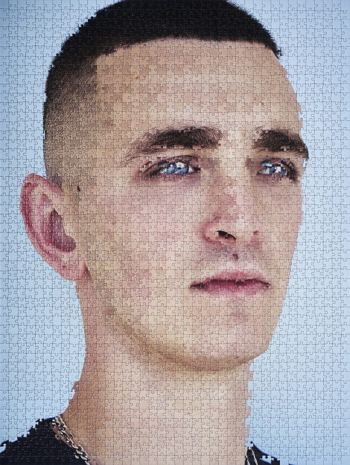 In Cat, the subject’s lips and eyes are fragmented, almost resembling a digital glitch — but it’s not. Every single choice that Haser makes is deliberate. It’s her hand that creates the traits of each subject. Utilizing puzzle pieces as a medium leans into the importance of detail and how every part of the puzzle is quite literally essential to make it a whole. Without a single piece, we’re left with a blank space and information missing. These glitches are minor; noticeable but intentional, still allowing our brains to read the figure as human, but just one with flaws.
