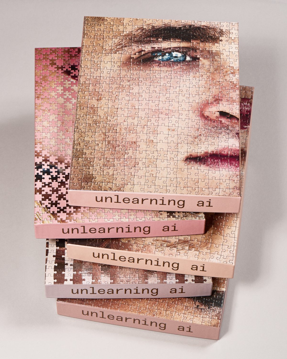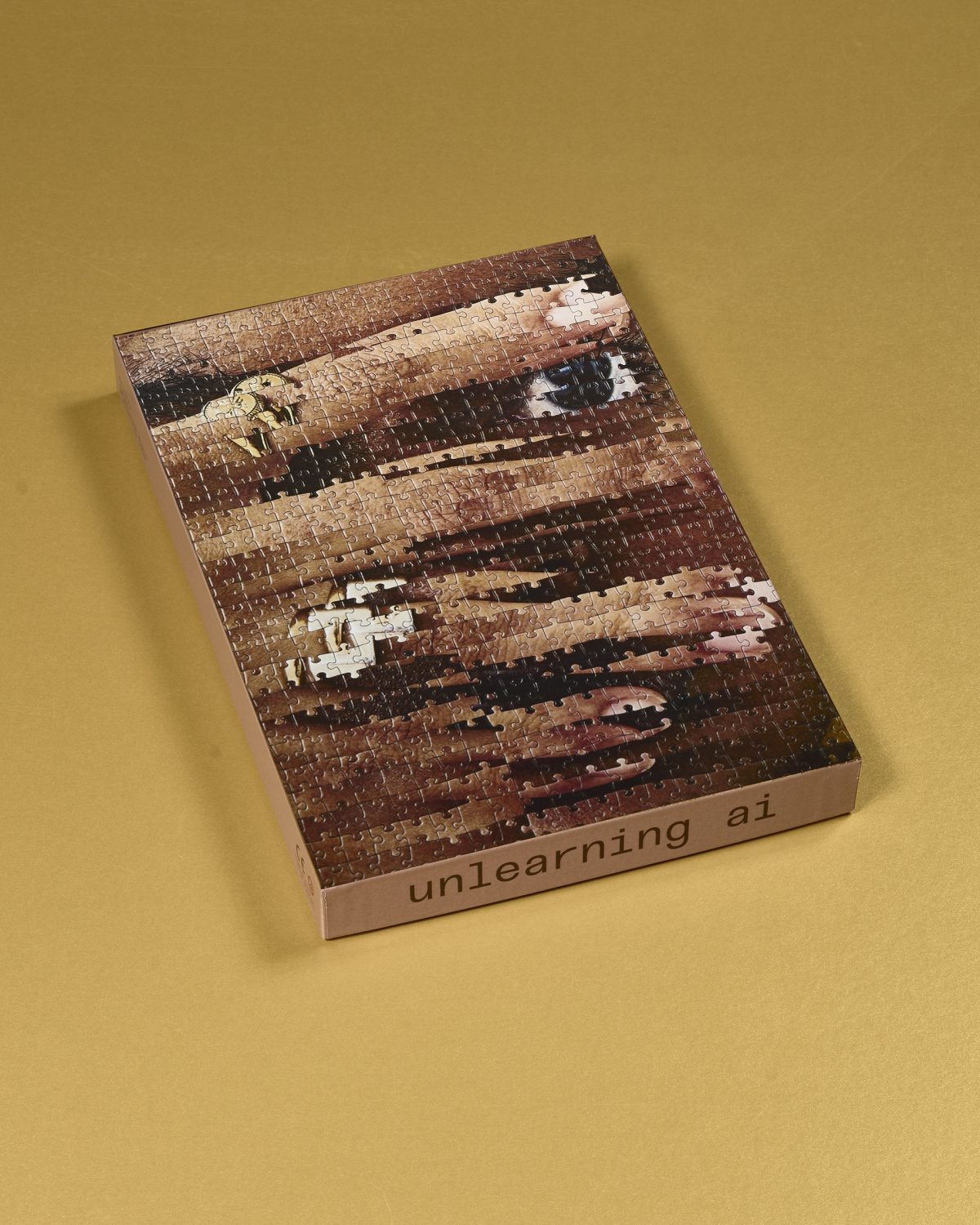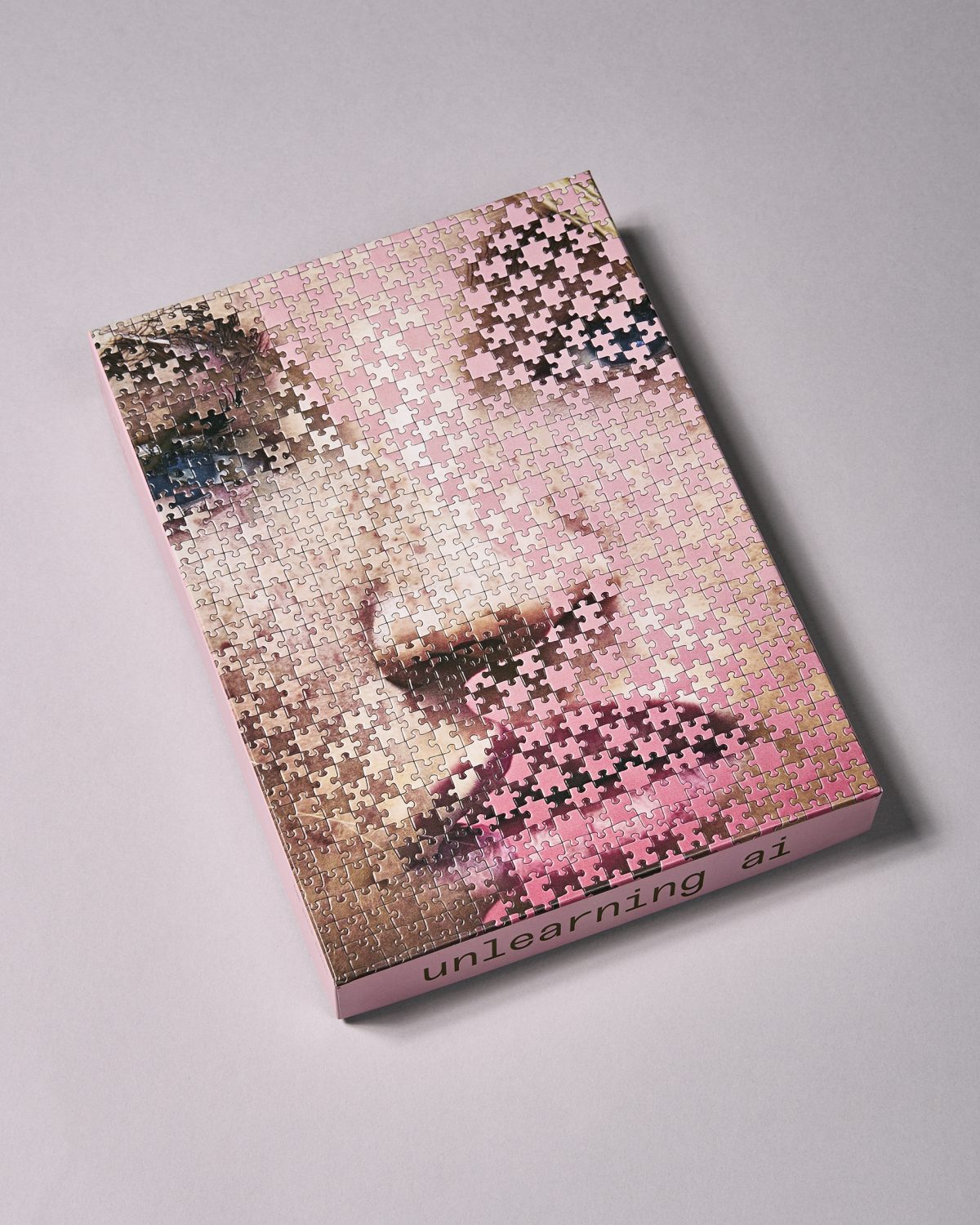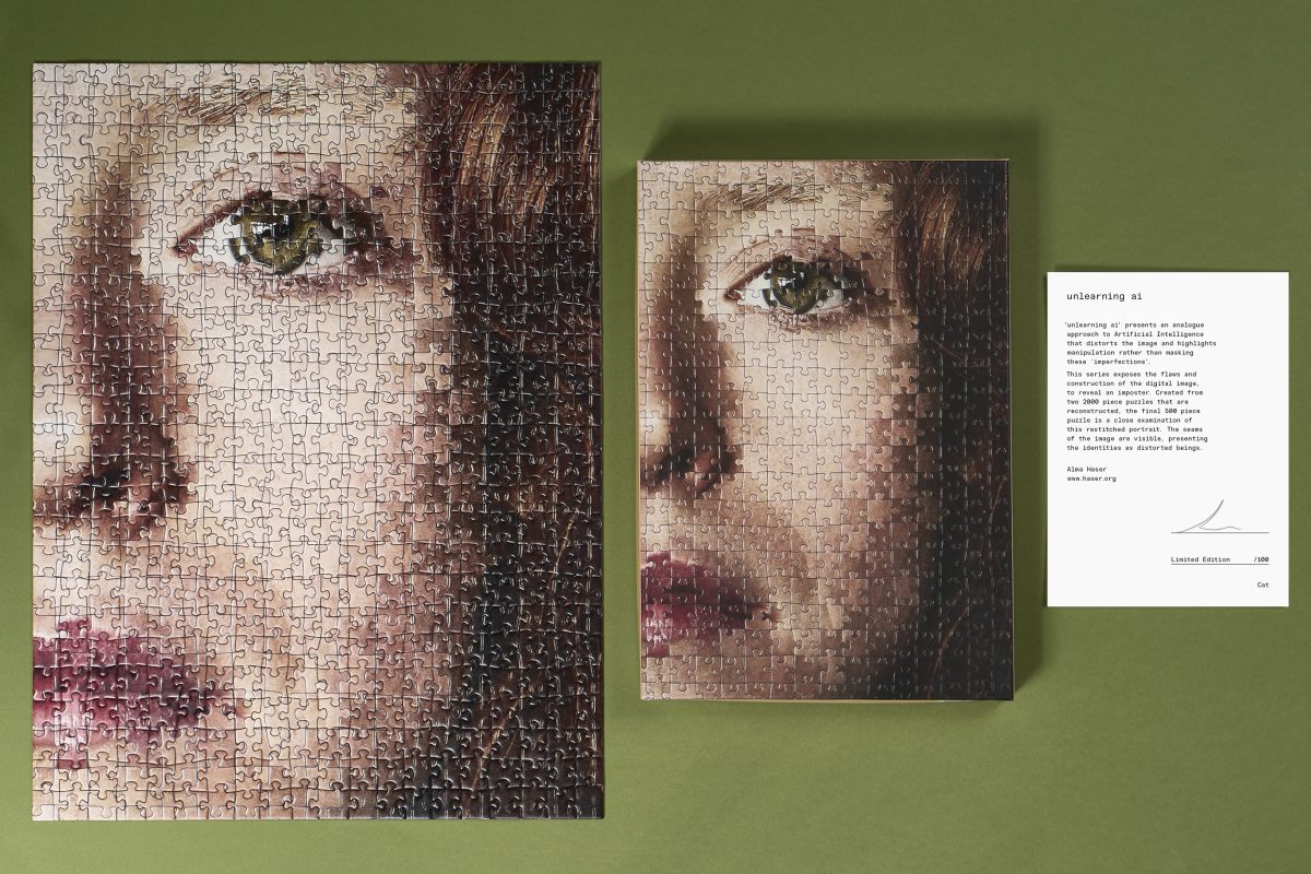 In her most recent and ongoing series, Unlearning AI, Haser creates her own kind of algorithm by combining jigsaw puzzle pieces together to make portraits, each with their own flaws and idiosyncrasies. The series includes five portraits, all of whom are people Haser originally photographed. She then meshes two 2,000 piece puzzles, reconstructing each of the portraits by hand, mixing and matching the features of each face. Each of them has a different kind of physicality, and Haser invites us to look at the seams and pieces of the puzzle, allowing us to be a detective searching for irregularities. However, these are not the AI generated portraits we’re accustomed to– ones that are unsettling and look almost too human, blurring our ability to tell what is real or not. Haser’s images embrace the flaws and excite us with their imperfections.