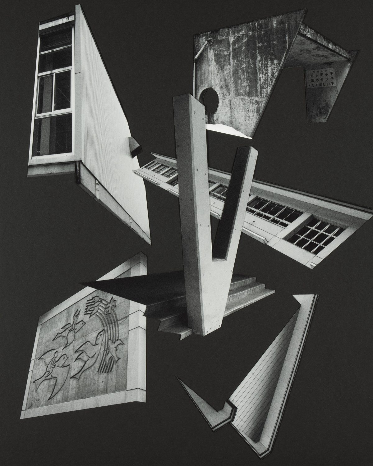 Sayuri aims to share her shocking experience and create visual impact through collages of the empty school buildings, showing them decaying and falling apart and conveying the lack of care that’s been shown to them. It’s a powerful way to present the buildings, pulling them apart visually in a way that playfully contrasts the seriousness of the topic.