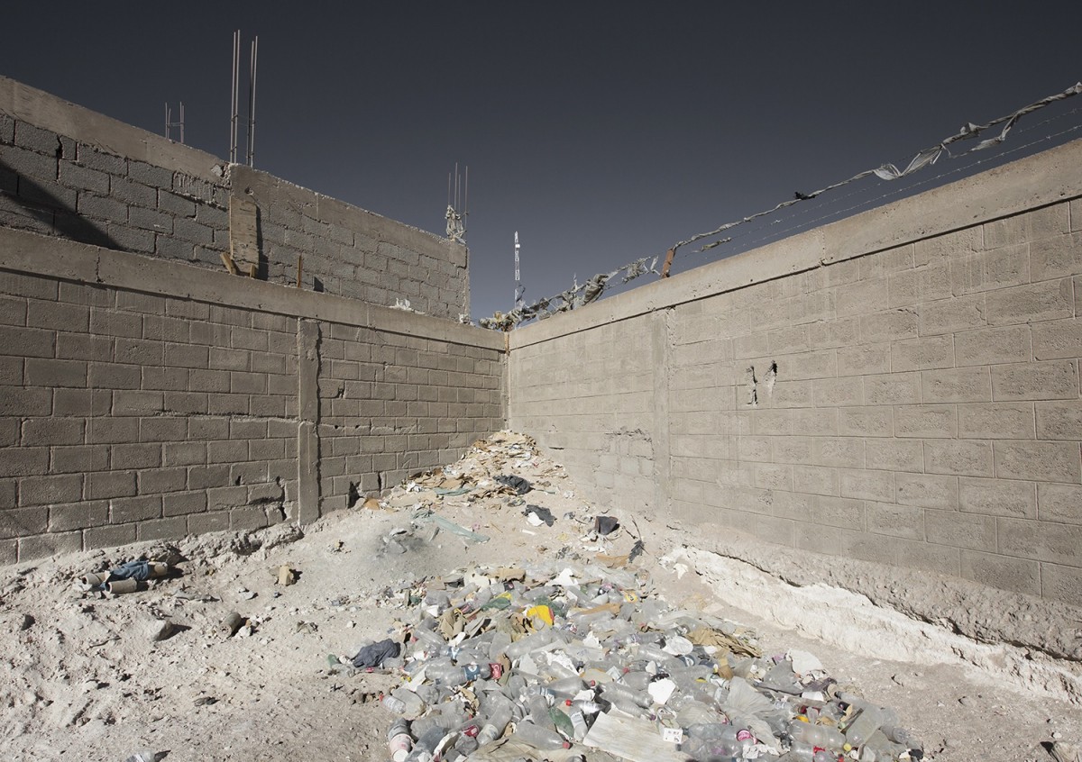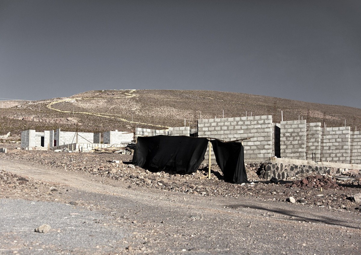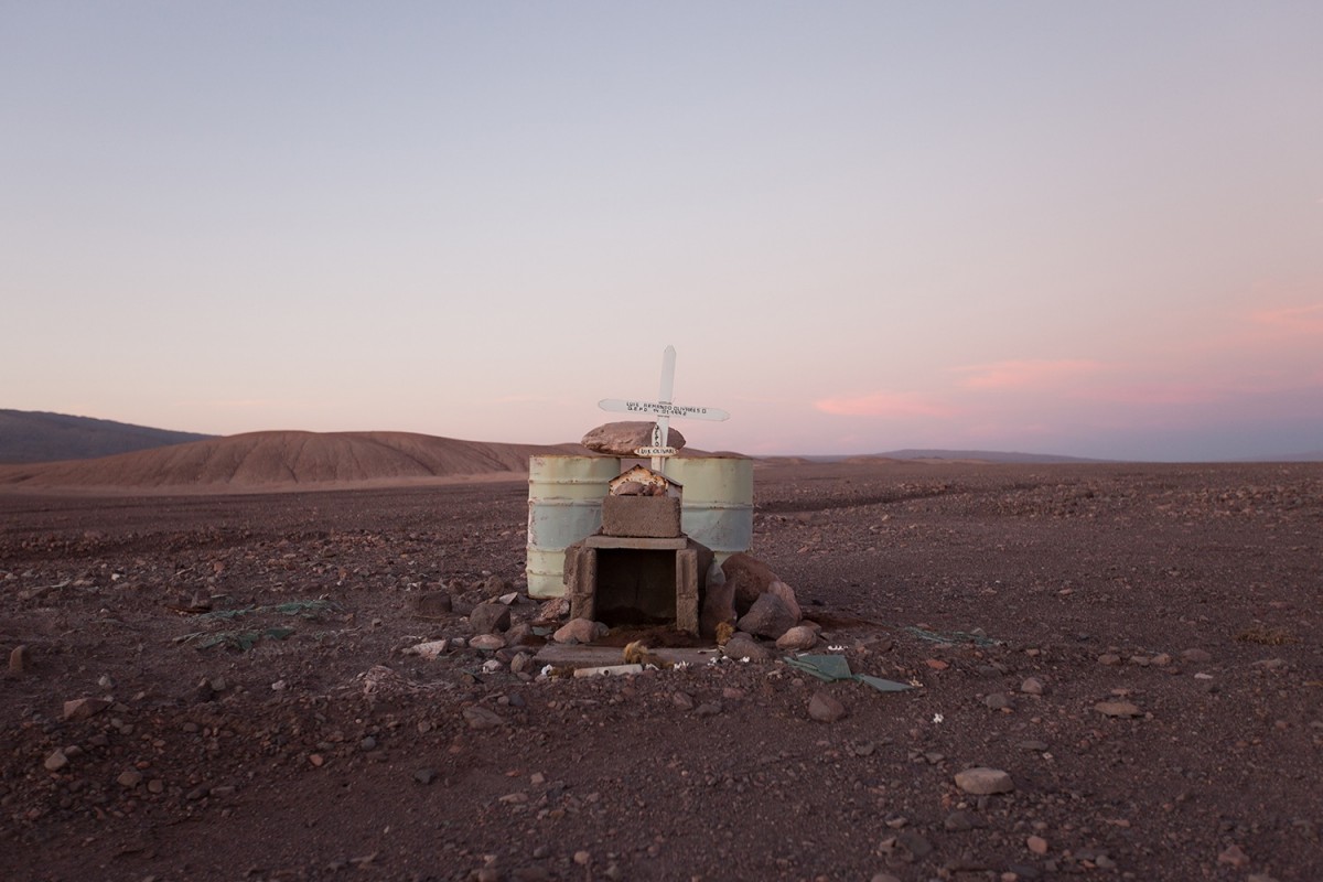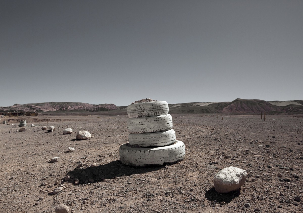 Within more than five hundred mining sites, a cemetery of plastic bottles and a pile of old tires are mere examples of the negligence that threatens the area. Her work records the ravages caused to the desert’s ecosystem.