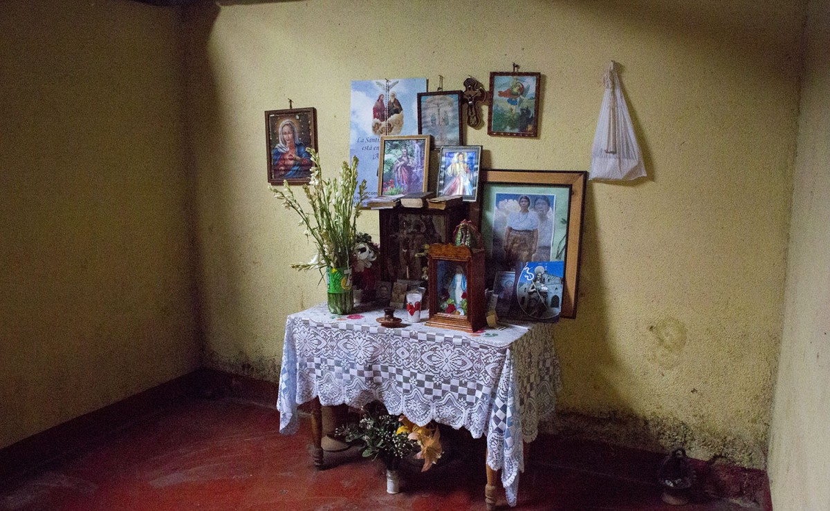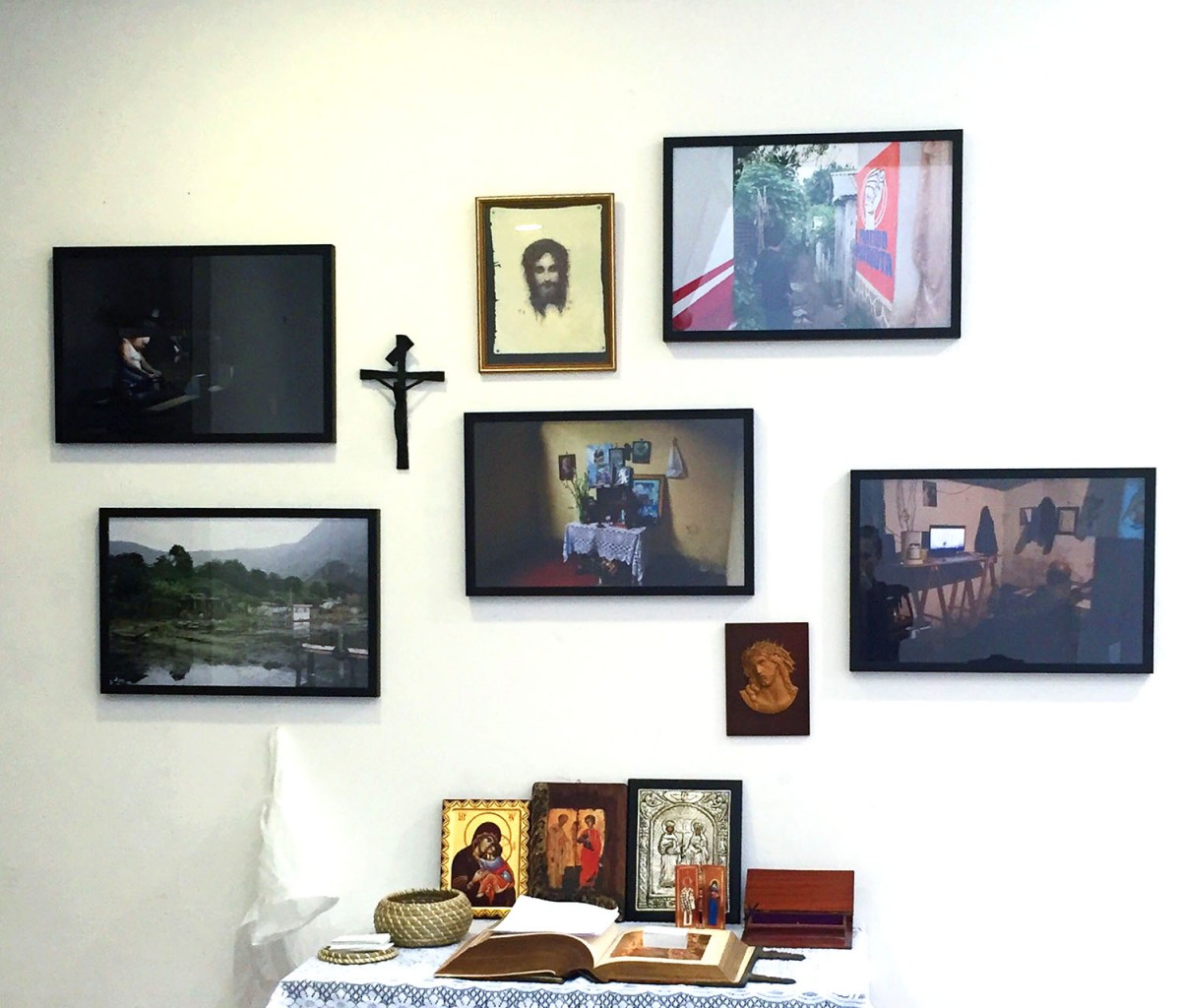 This series of work takes the form of a photographic interactive installation piece. The five images explore the past and present issues of Guatemalan people. The table I have included in the exhibition, as seen in the installation image, takes inspiration from the image of the religious that depicts a shrine to Jesus and the iconography of Guatemalan people, in the house of the Yojcom Pérez family I stayed with in the village San Juan La Laguna, Lake Atitlan. My table replicates the family’s table and consists of religious iconography and a diary of conversations taken from the family I stayed with.