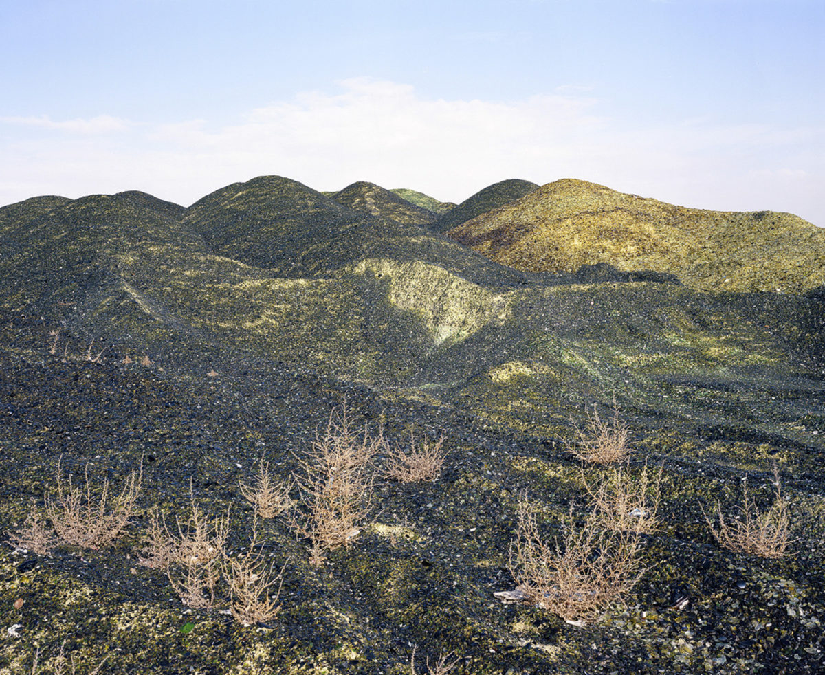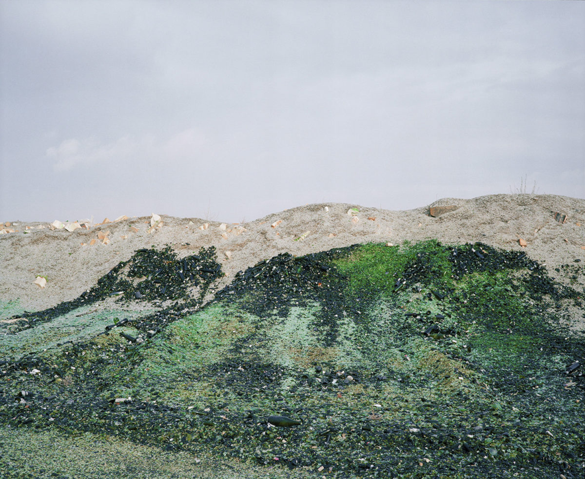 Outside the factory, heaps of olive green sit next to mounds of brown, light green, and clear glass. In the monotonous desert sands, the colorful hills are like a surreal nature reserve.
