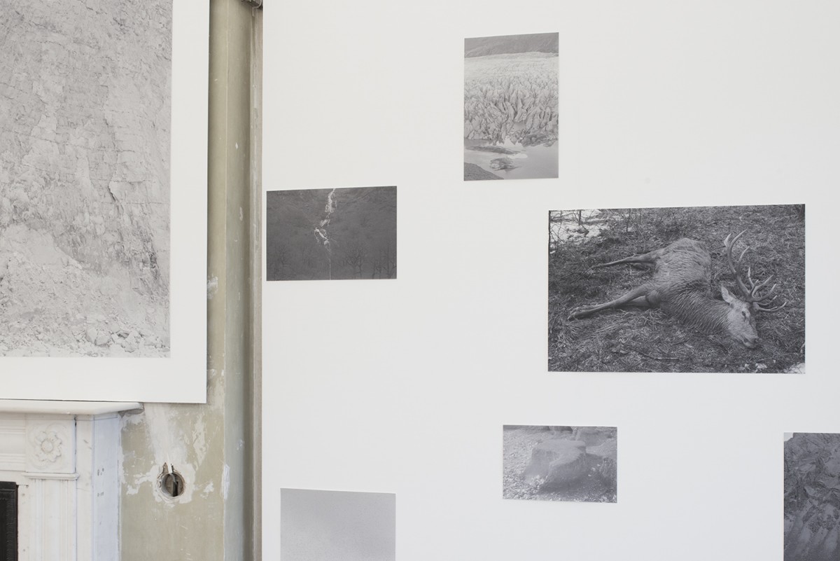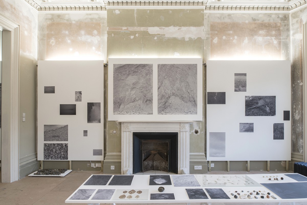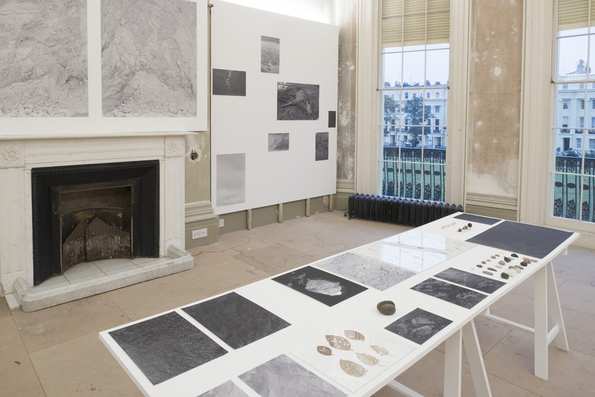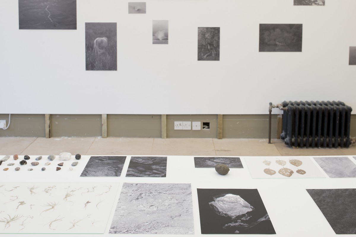 The additional material, (rocks, plants etc) heighten the physicality of the installation and are as much a part of the work as the photographs. The objects I chose to display speak about natural processes in the same way that I want my photographs to, so it seemed natural to have them together. I wanted the audience to consider the subjects of my images not just as abstract things in pictures, but as physical realities created by physical processes; to think about what is happening in them in the same way that looking at a pebble might make you consider how it came to be rounded.