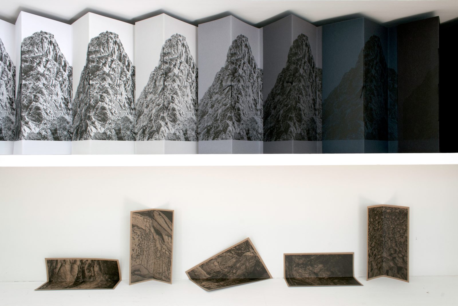 There is a conscious smallness to her publishing both in the physical size of the books and the edition sizes, which have ranged from 35-120 books. She assembles and binds all of the books by hand, working with local materials and processes. In 2021 she started to make deconstructed wall-mounted book objects as a way of reusing test prints that would usually be discarded. Installed open and uncovered, the paper is free to respond to the environment; creasing, curling, absorbing moisture and picking up fingerprints through encouraged handling. Publishing is a point in time, beyond which her work evolves into installations. Her exhibitions often interweave large scale prints with artefacts of her bookmaking practice. This pairing reflects both her iterative process of working in the landscape and examining the findings within the medium of the book, as well as her experience of encountering the land in glimpses and fragments of varying scale.