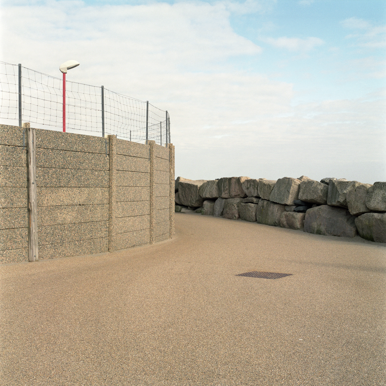 Victoria J. Dean’s image from Fortified Coastline is, formally, not untypical of a minimalist art-documentary style, in that it is depopulated, it tends to blankness, it has a large foregrounded emptiness and a dulled palette. For several reasons, it is a very good photograph. Such an image needs poise and nuance. Here the compositional run into the centre of the image sweeps to the upper left at the last moment. This turns shallowly receding lines into something claustrophobic. Similarly the textures of concrete, boulders and wire are brought close together near the centre of the image and, thus equated, are nearly-conjoined in their foreboding materiality.