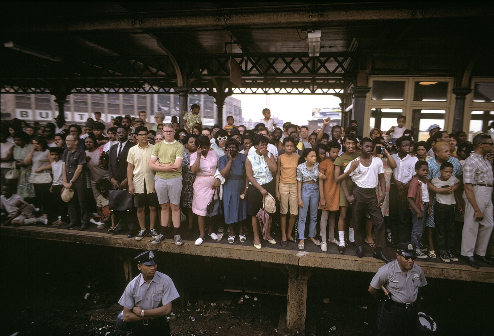 We know of those crowds now largely because among the press admitted to the train that day was a 38-year-old staff photographer from Look magazine named Paul Fusco. Fusco had been sent to photograph what went on inside the train, what Kennedy’s biographer Evan Thomas called the ‘disparate melange’ of people, the invited ‘celebrities and secretaries, true believers and hangers-on’ whose grief was observed ‘in manifold ways’. This was a carefully selected layering of American power at a time when power relations appeared to be shifting: from Robert S McNamara, US Secretary for Defence during the Vietnam War and John Lindsay, Mayor of New York, to those from the civil rights movement like Charles Evers older brother of the murdered activist Medgar Evers. Coretta Scott King, the wife of Martin Luther King, was there dressed in widow’s black, unaware of the breaking news that her husband’s killer had just been arrested in England. The actress Shirley MacLaine was there in ‘teary-eyed’ conversation with the football player Roosevelt Grier of the L.A. Rams, who had helped to force the gun from the hand of Kennedy’s assassin Sirhan Sirhan back in the Ambassador Hotel. They were members of a high-living set surrounding the Kennedys, part of the ‘swirling hive of beautiful people’ who attended their parties, their ‘imaginative happenings’, complete with light shows and Jefferson Airplane soundtrack. But Fusco chose to turn away from this official sadness, from the official story, because as the train emerged from under the Hudson River into the heat of New Jersey, he became engrossed in another more extraordinary sight: ‘the platforms of the stations were crowded with people. I was stunned. I don’t remember what happened in the car but I jumped up and ran to the window, pulled it down and stood in that spot until it got dark and photographed everything I saw on the track that day.’ Fusco’s impulse proved momentous. His resulting sequence of photographs, the story of the unbidden, is among the greatest and most singular projects of twentieth-century photojournalism, and in fact of modern photography altogether.